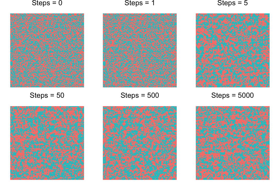 其中 $\mu = \min\left\lbrace\dfrac{e^{E\left(s_i^{\left(t\right)}\right) - E\left(s'_i\right)}}{kT}, 1\right\rbrace$ 表示接受转移的概率;$k \approx 1.38 \times 10^{23}$ 为玻尔兹曼常数。我们利用蒙特卡罗方法对其进行模拟 $T = 4J/k$的情况,我们分别保留第 $0, 1, 5, 50, 500, 5000$ 步的模拟结果