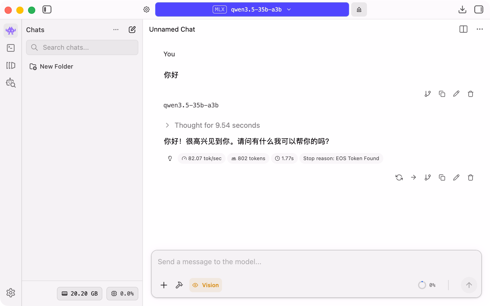 打开 LM Studio 主页面,选择对应的模型,即可开始对话: