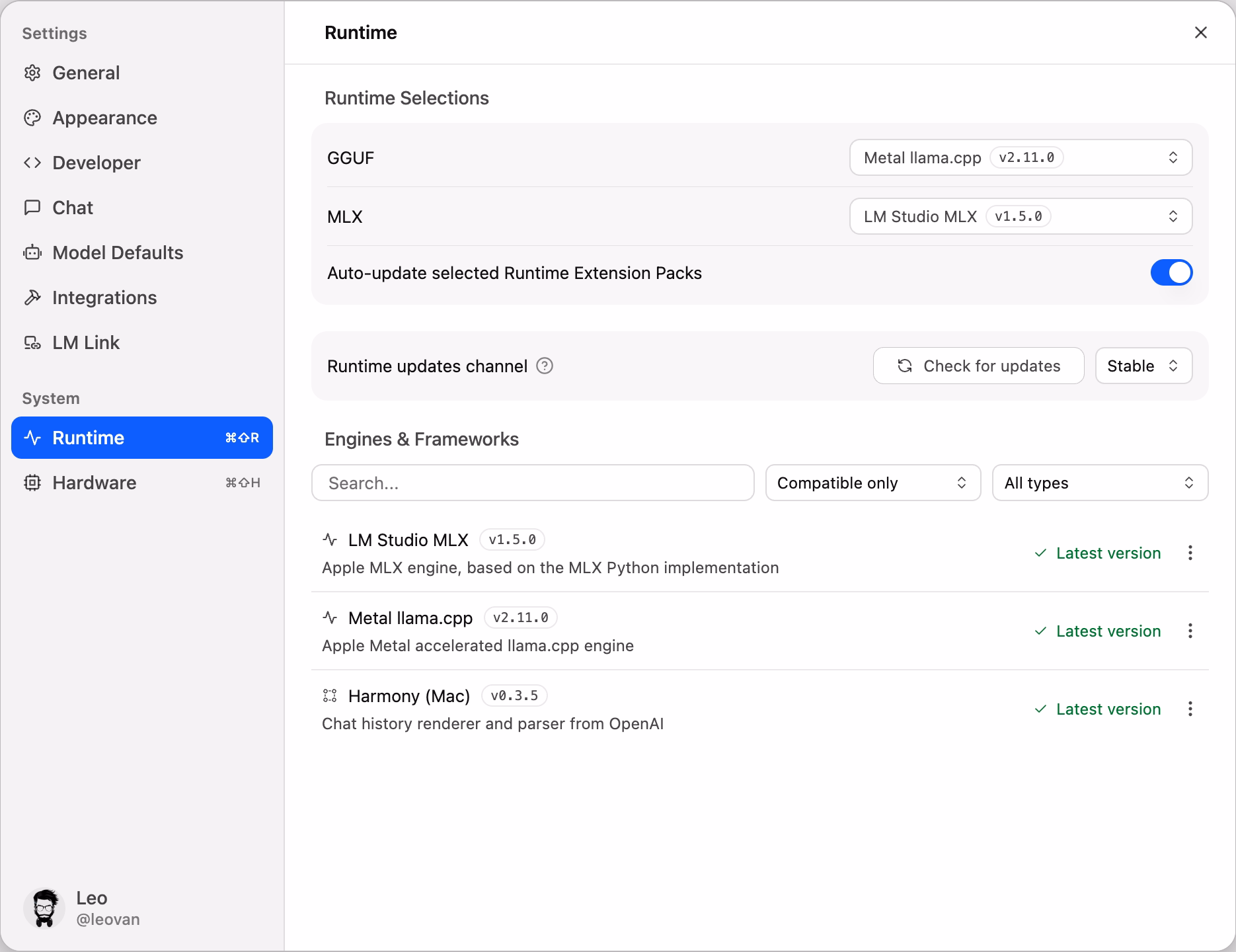 下载并安装所需的 Runtime,macOS 系统支持 GGUF 和 MLX 两种格式,Windows 系统仅支持 GGUF 格式。