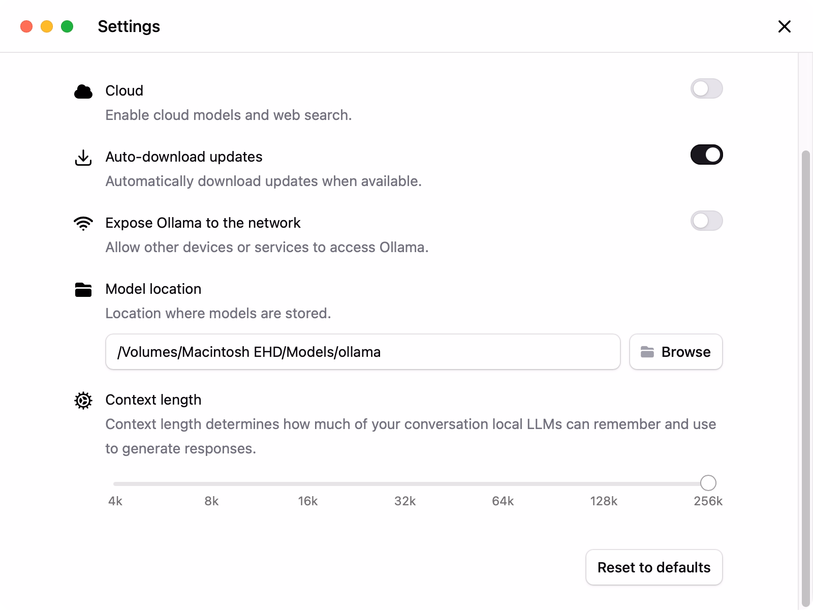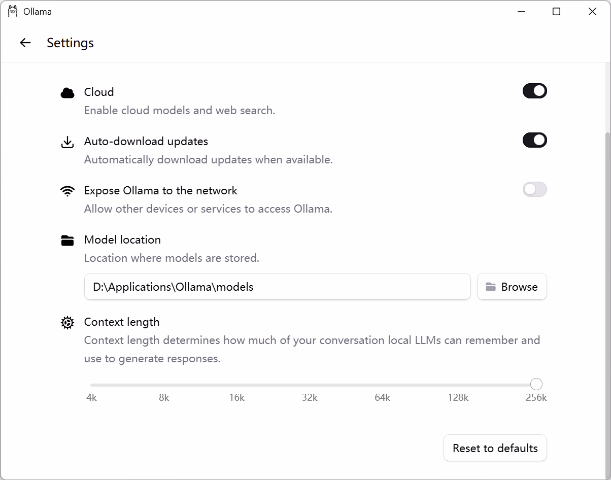 在 Settings - Model Defaults 中将 Default Context Length 设置为 Model Maximum,以确保在后续使用过程中不会因上下文长度不足而导致效果下降。