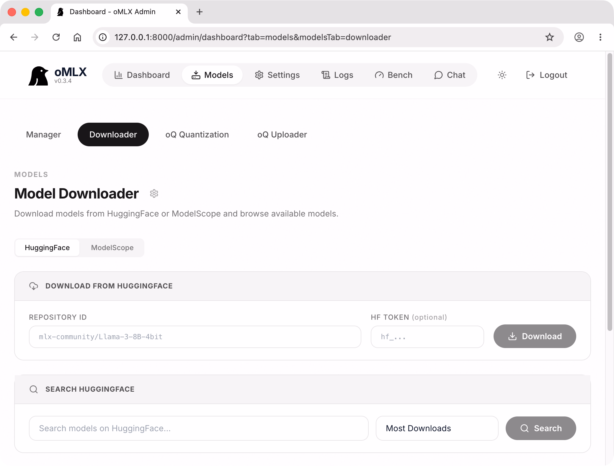 推荐从 oMLX 官网下载安装包,并运行安装 oMLX。安装完毕后启动,并从 macOS 菜单栏或 Windows 系统托盘单击 oMLX 图标,选择 Start Server 启动服务。待服务启动后,单击 Admin Panel 从浏览器打开管理面板,初次登录需要设置 API Key。在 Models - Downloader 中可以直接从 Hugging Face 和 ModelScope 模型仓库下载模型。