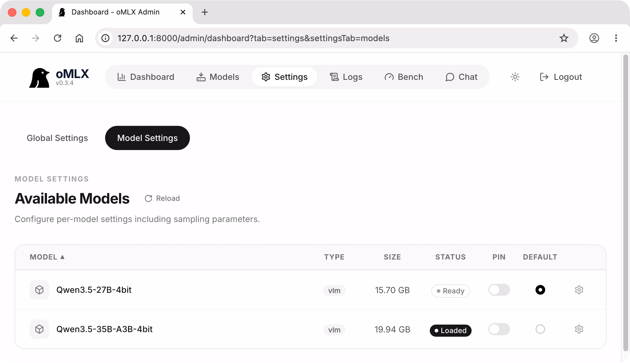 在 Settings - Model Settings 中单击对应模型 STATUS 中的按钮载入模型。